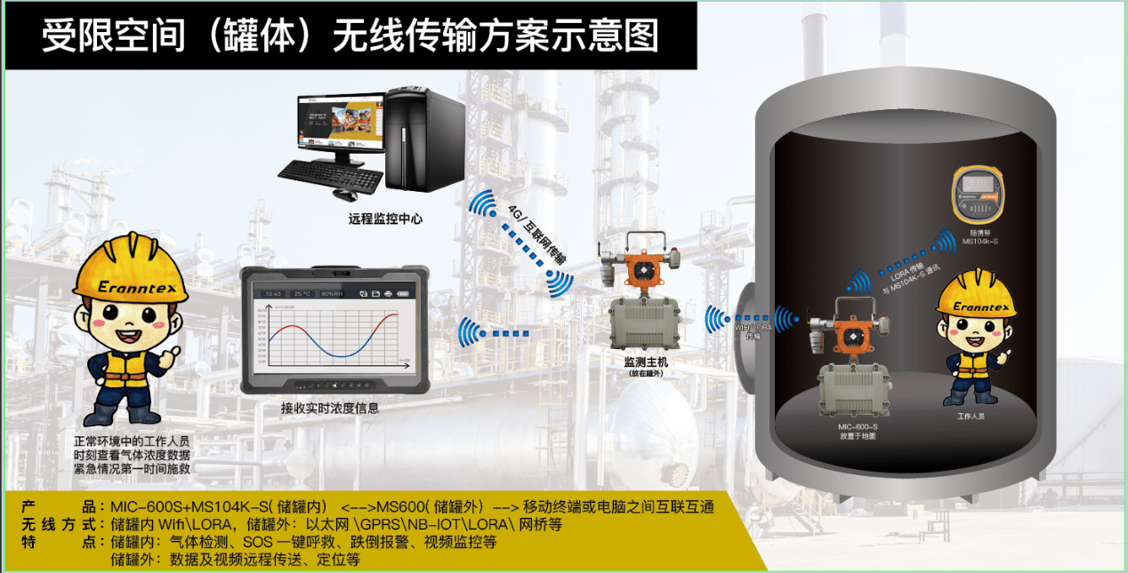 今天,我們就以氣體檢測(cè)行業(yè)的老大哥逸云天Eranntex為例,來(lái)說(shuō)說(shuō)如何進(jìn)行受限空間的氣體檢測(cè)。首先,在進(jìn)入受限空間作業(yè)前,工作人員會(huì)先用逸云天MIC-600S主機(jī)或泵吸式MS600對(duì)受限空間采樣檢測(cè),以檢測(cè)密閉空間中的氧氣、硫化氫、可燃?xì)?、VOC揮發(fā)性有機(jī)化合物等。確定安全后,工人才可以進(jìn)入作業(yè)。作業(yè)中,逸云天MIC-600S監(jiān)測(cè)主機(jī)在罐體外,將攝像頭架設(shè)在受限空間,工人佩戴一臺(tái)逸云天便攜式檢測(cè)儀MS600進(jìn)行作業(yè),隨時(shí)檢測(cè)所處環(huán)境的氣體濃度狀況,外邊監(jiān)護(hù)人員可通過(guò)手機(jī)或ipad進(jìn)行查看監(jiān)測(cè)數(shù)據(jù)和視頻圖像,實(shí)現(xiàn)遠(yuǎn)程高風(fēng)險(xiǎn)操作一體化監(jiān)管,徹底解決行業(yè)痛點(diǎn)。