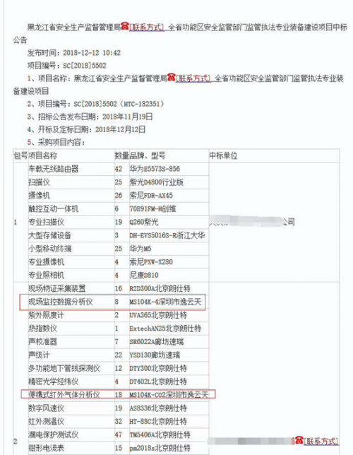 近日,深圳市逸云天電子有限公司分別接到河南省安全生產(chǎn)監(jiān)督管理局與黑龍江省安全生產(chǎn)監(jiān)督管理局的兩份中標(biāo)通知,成功中標(biāo)河南省安全生產(chǎn)管理2018年安全監(jiān)管執(zhí)法設(shè)備建設(shè)項目中央基建投資采購項目(采購編號:豫才招標(biāo)采購-2018-2033)與黑龍江省安全生產(chǎn)監(jiān)督管理局全省功能區(qū)安全監(jiān)管部門監(jiān)管執(zhí)法專業(yè)裝備建設(shè)項目(項目編號:sc[201815502(Hrc-182351)。