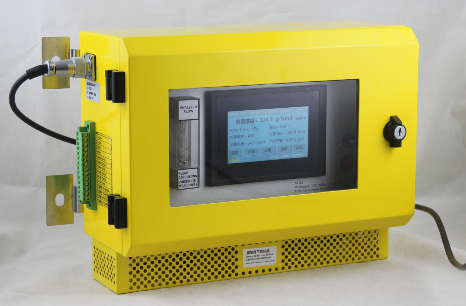 臭氧分析儀帶有觸摸屏操作界面,實時顯示臭氧氣體的濃度,帶有壓力和溫度補償及顯示,可設置自動校零時間和手動校零模式。高濃度(g/Nm3)量程帶有流量輸入功能,可實時顯示臭氧發(fā)生器的產(chǎn)量。帶有兩組繼電器信號輸出,用戶可自由選擇高報警點和低報警點信號輸出連接。核心部件采用紫外長壽命光源系統(tǒng),采用高透光率石英片,保證零點的穩(wěn)定性,防止零點漂移影響檢測濃度的準確性。根據(jù)國外光池技術設計的耐壓力,耐沖擊的獨立光池結構,校零操作時氣體流量、壓力、流速保持不變,防止氣流沖擊對校零產(chǎn)生影響,無需關閉臭氧進氣可完成校零操作,保證設備可以每天24小時連續(xù)運行。