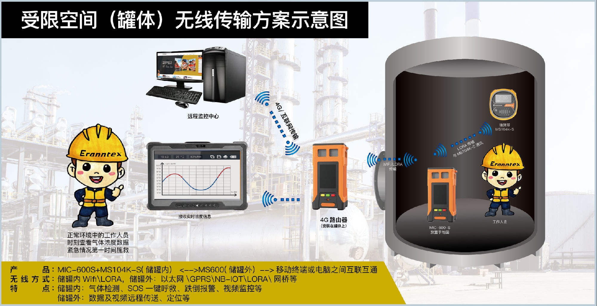 作業(yè)中,監(jiān)測(cè)主機(jī)在受限空間外。施工工人佩戴一臺(tái)便攜式檢測(cè)儀PTM600-S進(jìn)行作業(yè),隨時(shí)檢測(cè)所處環(huán)境的氣體濃度狀況,外邊監(jiān)護(hù)人員可通過手機(jī)或ipad進(jìn)行查看監(jiān)測(cè)數(shù)據(jù)。必要時(shí),可在內(nèi)部增加中繼設(shè)備延長傳輸距離。
